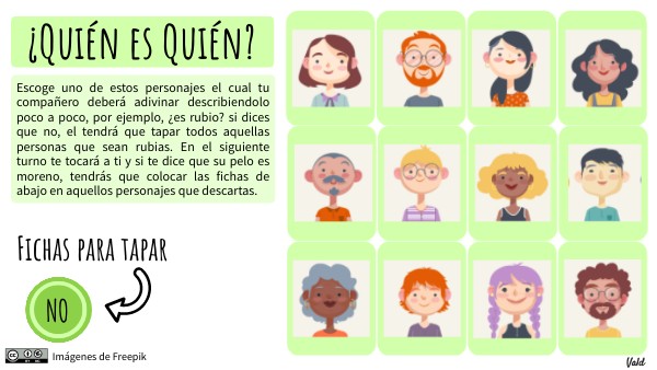 Escoge uno de estos personajes el cual tu compañero deberá adivinar describiendolo poco a poco, por ejemplo, ¿es rubio? si dices que no, el tendrá que tapar todos aquellas personas que sean rubias. En el siguiente turno te tocará a ti y si te dice que su pelo es moreno, tendrás que colocar las fichas de abajo en aquellos personajes que descartas.