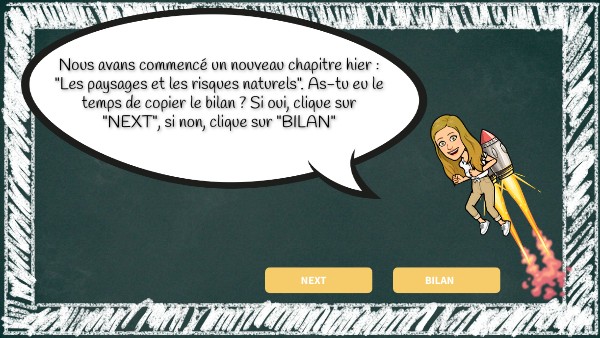 Nous avans commencé un nouveau chapitre hier : "Les paysages et les risques naturels". As-tu eu le temps de copier le bilan ? Si oui, clique sur "NEXT", si non, clique sur "BILAN"