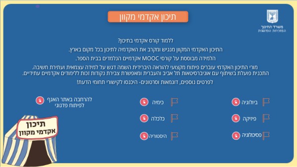 ללמוד קורס אקדמי בתיכון? התיכון האקדמי המקוון מנגיש ומקרב את האקדמיה לתיכון בכל מקום בארץ. הלמידה מבוססת על קורסי MOOC אקדמיים הנלמדים בבית הספר. מורי התיכון האקדמי עוברים פיתוח מקצועי להוראה היברידית השמה דגש על למידה עצמאית ועתירת חשיבה. התכנית פועלת בשיתוף עם אוניברסיטאות תל אביב והעברית ומאפשרת צבירת נקודות זכות ללימודים אקדמיים עתידיים. לפרטים נוספים, דוגמאות וסרטונים- היכנסו לקישורי תחומי הדעת!