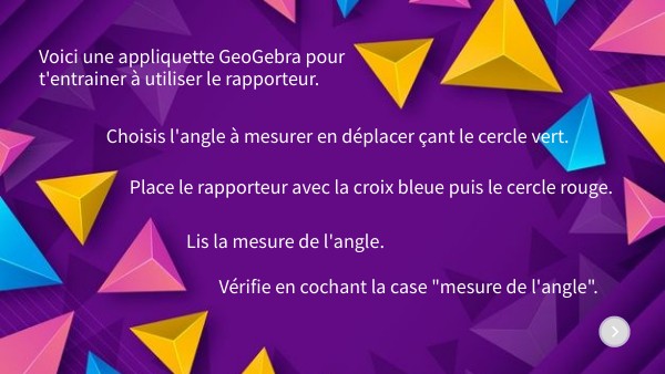 Voici une appliquette GeoGebra pour t'entrainer à utiliser le rapporteur.