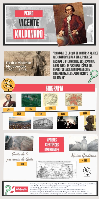 Montaño, Joaquín. (9 de January de 2019). Pedro Vicente Maldonado: biografía, aportes científicos y obras. Lifeder. Recuperado de https://www.lifeder.com/pedro-vicente-maldonado/. esri.Ecuador(s,f)Pedro Vicente Maldonado.Recuperado de:mALDhttps://storymaps.arcgis.com/stories/ee40a9ab2c434fb8a8f3c9bbceeffac3 Autor anónimo (2016). Pedro Vicente Maldonado. Recuperado el 31 de mayo del 2021 de: https://www.ultimasnoticias.ec/noticias/pedro-vicente-maldonado-cientifico-politico.html