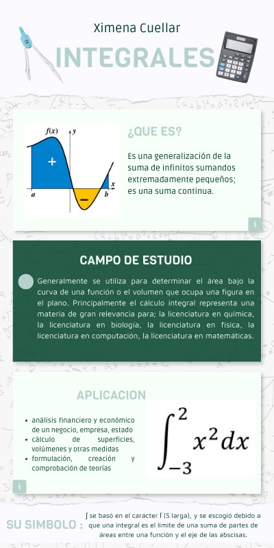 Generalmente se utiliza para determinar el área bajo la curva de una función o el volumen que ocupa una figura en el plano. Principalmente el cálculo integral representa una materia de gran relevancia para; la licenciatura en química, la licenciatura en biología, la licenciatura en física, la licenciatura en computación, la licenciatura en matemáticas.