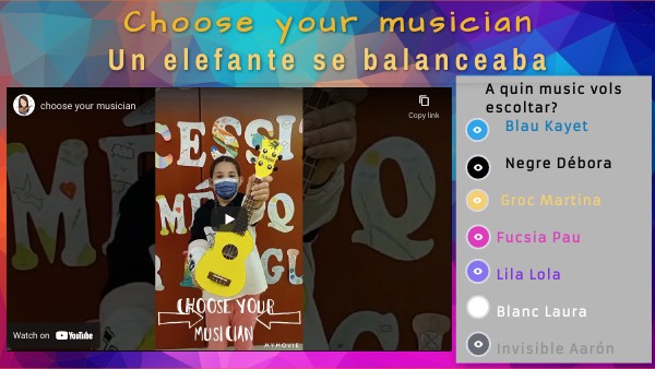 A quin music vols escoltar? Blau Kayet Negre Débora Groc Martina Fucsia Pau Lila Lola Blanc Laura Invisible Aarón