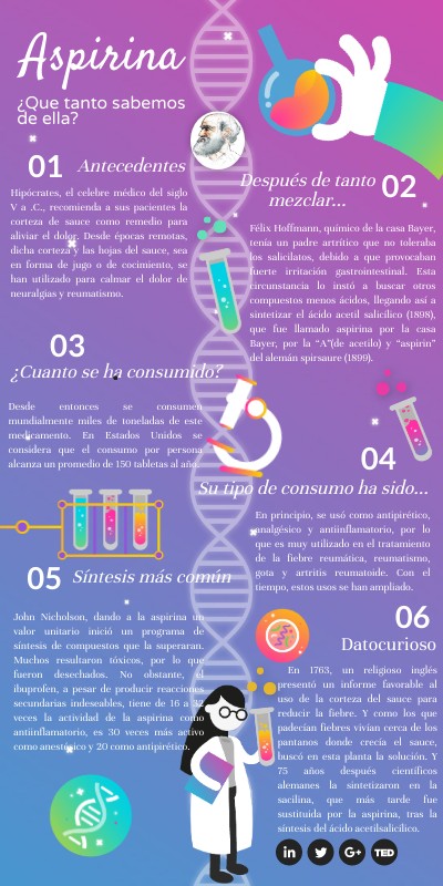 Félix Hoffmann, químico de la casa Bayer, tenía un padre artrítico que no toleraba los salicilatos, debido a que provocaban fuerte irritación gastrointestinal. Esta circunstancia lo instó a buscar otros compuestos menos ácidos, llegando así a sintetizar el ácido acetil salicílico (1898), que fue llamado aspirina por la casa Bayer, por la “A”(de acetilo) y “aspirin” del alemán spirsaure (1899).