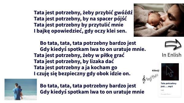Tata jest potrzebny, żeby przybić gwóźdź Tata jest potrzebny, by na spacer pójść Tata jest potrzebny by przytulić mnie I bajkę opowiedzieć, gdy oczy klei sen. Bo tata, tata, tata potrzebny bardzo jest Gdy kiedyś spotkam lwa to on uratuje mnie. Tata jest potrzebny, żeby w piłkę grać Tata jest potrzebny, by lizaka dać Tata jest potrzebny a ja kocham go I czuję się bezpieczny gdy obok idzie on. Bo tata, tata, tata potrzebny bardzo jest Gdy kiedyś spotkam lwa to on uratuje mnie