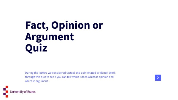 During the lecture we considered factual and opinionated evidence. Work through this quiz to see if you can tell which is fact, which is opinion and which is argument