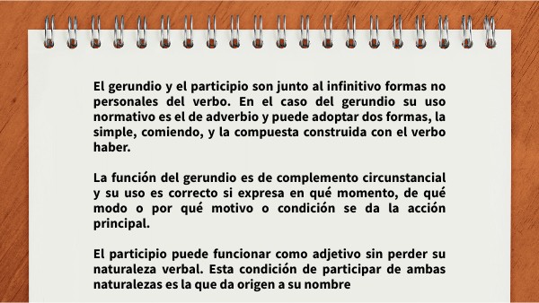 El gerundio y el participio son junto al infinitivo formas no personales del verbo. En el caso del gerundio su uso normativo es el de adverbio y puede adoptar dos formas, la simple, comiendo, y la compuesta construida con el verbo haber. La función del gerundio es de complemento circunstancial y su uso es correcto si expresa en qué momento, de qué modo o por qué motivo o condición se da la acción principal. El participio puede funcionar como adjetivo sin perder su naturaleza verbal. Esta condición de participar de ambas naturalezas es la que da origen a su nombre