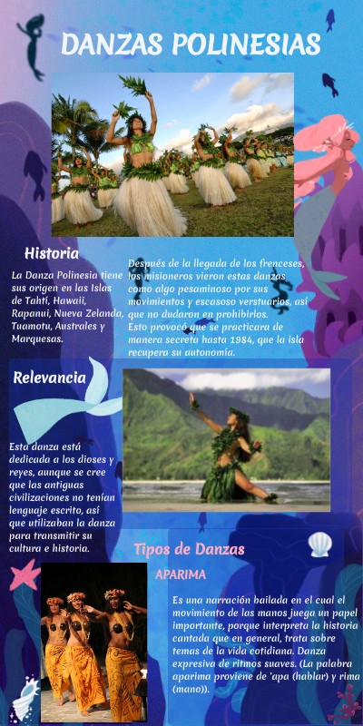 La Danza Polinesia tiene sus origen en las Islas de Tahtí, Hawaii, Rapanui, Nueva Zelanda, Tuamotu, Australes y Marquesas.