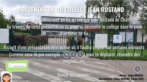 Tu rentreras prochainement en 6e au collège Jean Rostand de Châtenois. Au travers de cette présentation tu pourras découvrir le collège dans la peau d'un élève de 6e. Il s'agit d'une présentation interactive où il faudra cliquer sur certains éléments (comme ceux-là par exemple : ) pour te déplacer, résoudre des énigmes, etc. Bonne découverte !