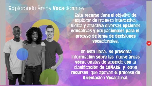 Este recurso tiene el objetivo de explorar de manera interactiva, lúdica y atractiva diversas opciones educativas y ocupacionales para el proceso de toma de decisiones vocacionales. En esta línea, se presenta información sobre las nueve áreas vocacionales de acuerdo con la clasificación de CONARE y otros recursos que apoyan el proceso de Orientación Vocacional.