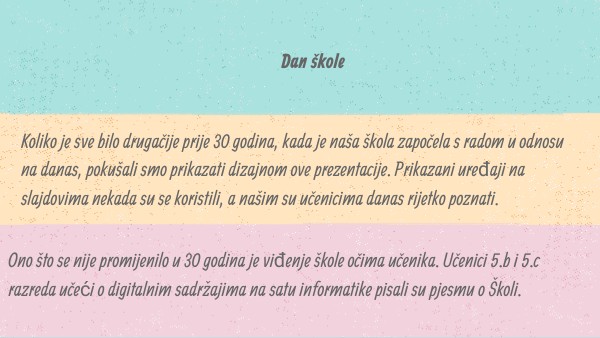 Ono što se nije promijenilo u 30 godina je viđenje škole očima učenika. Učenici 5.b i 5.c razreda učeći o digitalnim sadržajima na satu informatike pisali su pjesmu o Školi.