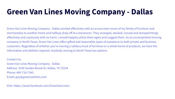 Green Van Lines Moving Company - Dallas worked effectively with an across town move of my family of furniture and merchandise to another home and halfway drop off at a storeroom. They arranged, stacked, moved and dumped things effectively and cautiously with no harm. I would happily utilize them again and suggest them. As an accomplished moving company in North Texas, Green Van Lines offers gifted and reasonable types of assistance to both private and business customers. Regardless of whether you're moving a solitary truck of furniture or a whole home of products, we have the information and abilities required. Anybody moving to North Texas has options. Contact Us: Green Van Lines Moving Company - Dallas Address: 3109 Garden Brook Dr, Dallas, TX 75234 Phone: 469-718-7343 Email: guy@greenvanlines.com Visit: https://www.facebook.com/GreenVanLines/