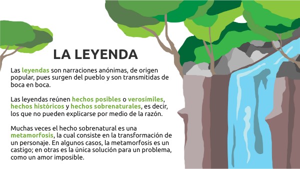 Las leyendas son narraciones anónimas, de origen popular, pues surgen del pueblo y son transmitidas de boca en boca. Las leyendas reúnen hechos posibles o verosímiles, hechos históricos y hechos sobrenaturales, es decir, los que no pueden explicarse por medio de la razón. Muchas veces el hecho sobrenatural es una metamorfosis, la cual consiste en la transformación de un personaje. En algunos casos, la metamorfosis es un castigo; en otras es la única solución para un problema, como un amor imposible.