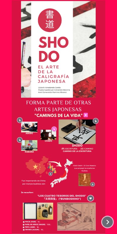 Referencias: Hiro. (12 de septiembre de 2018). Japanese Calligraphy. Recuperado el 7 de junio de 2021, de Oriental Souls: https://orientalsouls.com/blog/japanese-calligraphy/which-style-of-kanji-you-like-most-various-writing-styles-of-japanese-kanji-characters/ Javi. (22 de octubre de 2020). Shodō, el arte japonés de la escritura. Recuperado el 7 de junio de 2021, de Japon Secreto: https://japon-secreto.com/shodo-arte-caligrafia-japonesa/ Kyoko. (2019). Caligrafía japonesa, el arte del Shodo (Origen y estilos). Recuperado el 7 de junio de 2021, de Japon Pedia: https://japonpedia.com/caligrafia-japonesa/ Narita, M. (2021). About "Shodo". Recuperado el 7 de junio de 2021, de Masumi Narita - Japanese Calligraphy Artist: http://japanart-masumi.fudejiya.com/about-shodo/