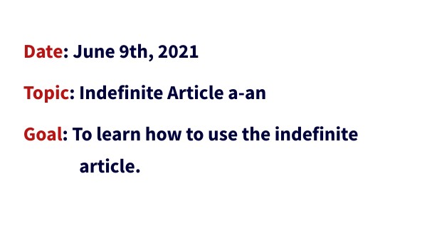 Date: June 9th, 2021Topic: Indefinite Article a-an Goal: To learn how to use the indefinite article.