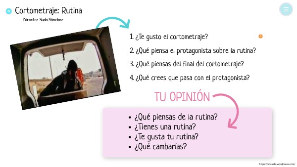 1. ¿Te gusto el cortometraje?2. ¿Qué piensa el protagonista sobre la rutina? 3. ¿Qué piensas del final del cortometraje? 4. ¿Qué crees que pasa con el protagonista?