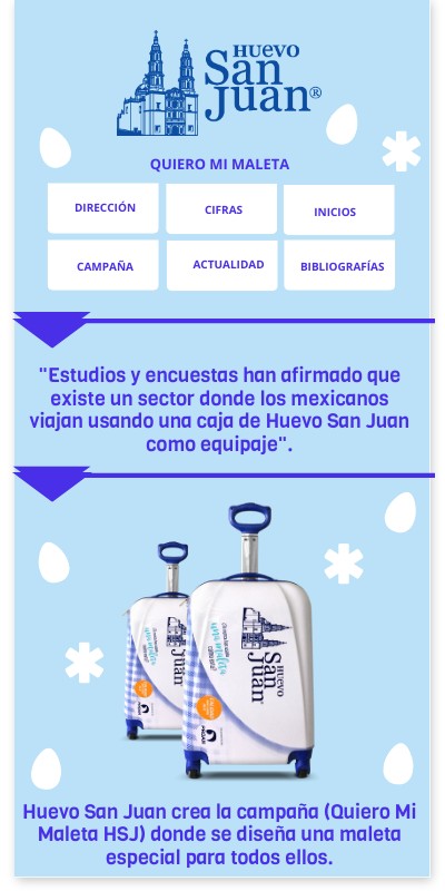https://www.elfinanciero.com.mx/empresas/has-usado-esta-caja-de-huevo-al-viajar-la-empresa-te-regala-la-maleta/ https://www.altonivel.com.mx/marketing/secreto-intercambiar-cajas-huevo-maletas/ https://quieromimaletahsj.com/ https://www.youtube.com/watch?v=JQasgiP2peA https://www.dineroenimagen.com/2017-11-09/92829#:~:text=CIUDAD%20DE%20M%C3%89XICO.,dio%20a%20conocer%20esta%20noticia.