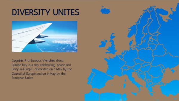 Gegužės 9 d. Europos Vienybės diena.Europe Day is a day celebrating "peace and unity in Europe" celebrated on 5 May by the Council of Europe and on 9 May by the European Union.