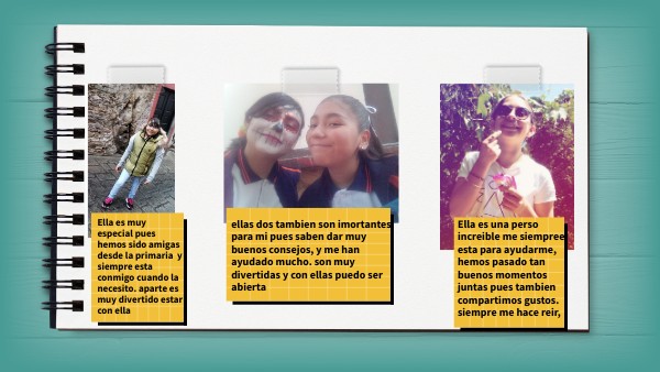 Ella es muy especial pues hemos sido amigas desde la primaria y siempre esta conmigo cuando la necesito. aparte es muy divertido estar con ella