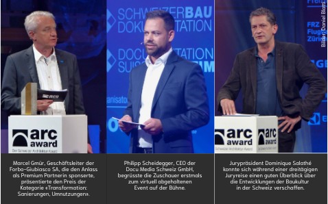 Marcel Gmür, Geschäftsleiter der Forbo-Giubiasco SA, die den Anlass als Premium Partnerin sponserte, präsentierte den Preis der Kategorie «Transformation: Sanierungen, Umnutzungen».