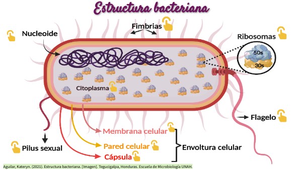 Aguilar, Kateryn. (2021). Estructura bacteriana. [Imagen]. Tegucigalpa, Honduras. Escuela de Microbiología UNAH.