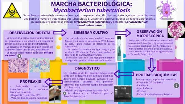 Los resultados de las pruebas bioquimicas junto con el desarrollo en el medio eugónico dentro del tiempo pausado sumado a sus caracteristicas celulares nos permiten confirmar que el animal estaba infectado por M. tuberculosis.- Método de diagnostico más rapido: PCR - Se descarta la infección por C. Pseudotuberculosis