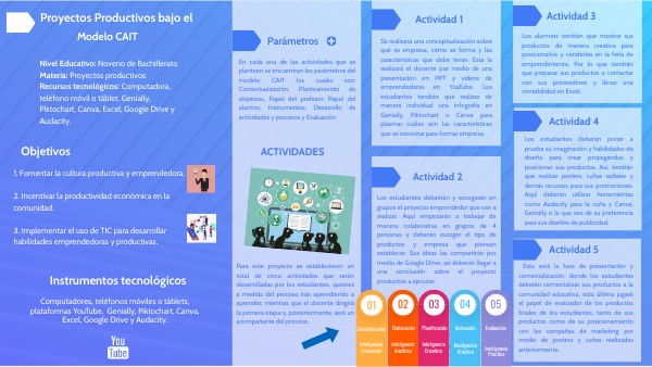 Nivel Educativo: Noveno de BachilleratoMateria: Proyectos productivos Recursos tecnológicos: Computadora, teléfono móvil o táblet. Genially, Piktochart, Canva, Excel, Google Drive y Audacity.