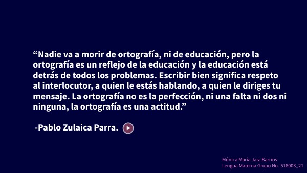 “Nadie va a morir de ortografía, ni de educación, pero la ortografía es un reflejo de la educación y la educación está detrás de todos los problemas. Escribir bien significa respeto al interlocutor, a quien le estás hablando, a quien le diriges tu mensaje. La ortografía no es la perfección, ni una falta ni dos ni ninguna, la ortografía es una actitud.” -Pablo Zulaica Parra.