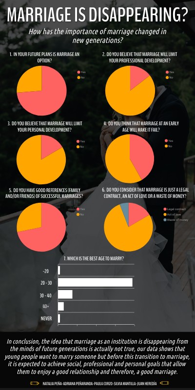 In conclusion, the idea that marriage as an institution is disappearing from the minds of future generations is actually not true, our data shows that young people want to marry someone but before this transition to marriage, it is expected to achieve social, professional and personal goals that allow them to enjoy a good relationship and therefore, a good marriage.