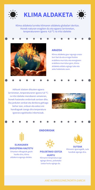 Klima aldaketa lurreko klimaren aldaketa globalari deritzo. Honek naturan eragiten du eta egoera larrienetan, tenperaturaren igoera 4,8 ºC-ra iritsi daiteke