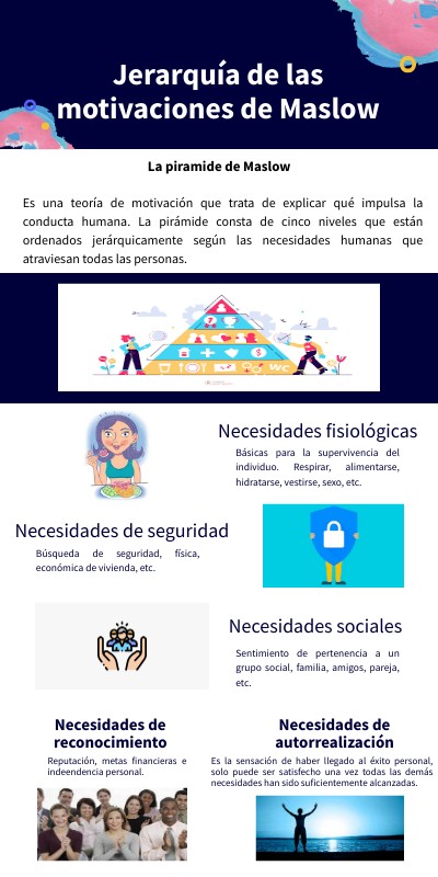 Es una teoría de motivación que trata de explicar qué impulsa la conducta humana. La pirámide consta de cinco niveles que están ordenados jerárquicamente según las necesidades humanas que atraviesan todas las personas.