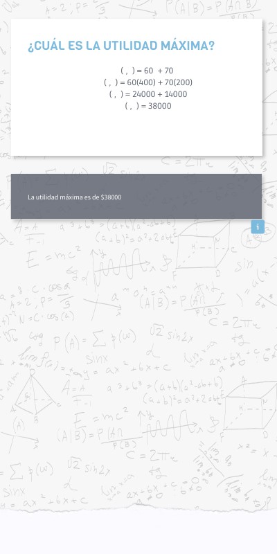 𝑓(𝑥, 𝑦) = 60𝑥 + 70𝑦 𝑓(𝑥, 𝑦) = 60(400) + 70(200) 𝑓(𝑥, 𝑦) = 24000 + 14000 𝑓(𝑥, 𝑦) = 38000