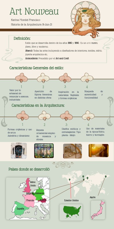 Estilo que se desarrolla dentro de los años 1880 y 1890. Es un arte nuevo, jóven, libre y moderno. Abarcó: Todas las artes incluyendo a diseñadores de interiores, textiles, vidrio, joyería arquitectos etc. Antecedente: Precedido por el Art and Craft