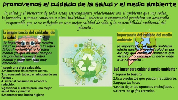 la salud y el bienestar de todos estan estrechamente relacionados con el ambiente que nos rodea. Informados y tomar conducta a nivel individual , colectivo y empresarial propician un desarrollo responsable que se ve reflejado en una mejor calidad de vida y la sostenibilidad ambiental del planeta .