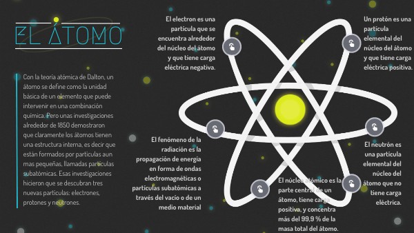Con la teoría atómica de Dalton, un átomo se define como la unidad básica de un elemento que puede intervenir en una combinación química. Pero unas investigaciones alrededor de 1850 demostraron que claramente los átomos tienen una estructura interna, es decir que están formados por partículas aun mas pequeñas, llamadas partículas subatómicas. Esas investigaciones hicieron que se descubran tres nuevas partículas: electrones, protones y neutrones.