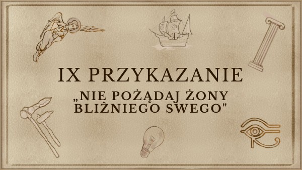 IX Przykazanie zakazuje nam odbierać innym miłość, niszczyć innym małżeństwo. "Co Bóg złączył człowiek niech nie rozdziela". Tak naprawdę ten cytat dotyczy czegoś innego, ale tutaj też można go przytoczyć. Nie powinniśmy nawet marzyć o osobie, która już związała się z inną, założyła z nią rodzinę. Przykazanie każe nam szukać do związku osoby, która jest jeszcze przez nikogonie zajęta. Jeśli kogoś kochamy, dla jego dobra nie odbierajmy mu tego co sam starał się stworzyć - kochającego męża/kochającą żonę.