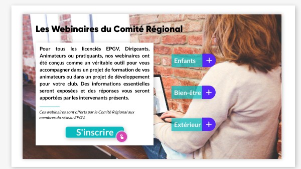 Pour tous les licenciés EPGV, Dirigeants, Animateurs ou pratiquants, nos webinaires ont été conçus comme un véritable outil pour vous accompagner dans un projet de formation de vos animateurs ou dans un projet de développement pour votre club. Des informations essentielles seront exposées et des réponses vous seront apportées par les intervenants présents.