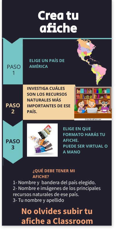 1- Nombre y bandera del país elegido. 2- Nombre e imágenes de los principales recursos naturales de ese país. 3- Tu nombre y apellido