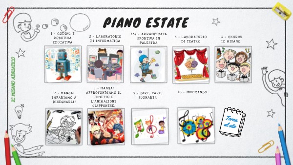 Destinatari: Alunni uscenti dalle quinte, prime e seconde medie Formatore: Sergio Algozzino - Cartoon Club Calendario: Dal 5 al 13 luglio dal lunedì al venerdì (7 incontri di due ore: 5, 6, 7, 8, 9, 12, 13 luglio). Orario incontri: Primo gruppo 08:15 – 10:15 Secondo gruppo 10:30 – 12:30Luoghi: Scuola media Iscrizioni: https://forms.gle/fiRoCej8BegLEgux6 (modulo compilabile con accesso a Google) Le iscrizioni saranno accolte in ordine di ricezione fino a esaurimento dei posti (15 alunni per ogni gruppo). A meno di particolari necessità dovute al rischio di sovrapposizioni con altri corsi, gli alunni saranno inseriti nei gruppi per fasce d’età (alle 8:15 quinte primaria e prima media, alle 10:30 seconda media).