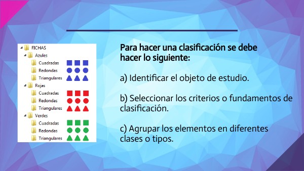 Para hacer una clasificación se debe hacer lo siguiente: a) Identificar el objeto de estudio. b) Seleccionar los criterios o fundamentos de clasificación. c) Agrupar los elementos en diferentes clases o tipos.