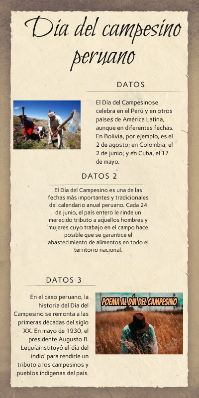El Día del Campesinose celebra en el Perú y en otros países de América Latina, aunque en diferentes fechas. En Bolivia, por ejemplo, es el 2 de agosto; en Colombia, el 2 de junio; y en Cuba, el 17 de mayo.