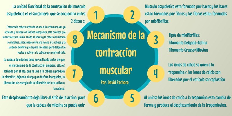 Entonces la cabeza activada se une a la actina una vez ya activada y se libera el fosfato inorgánico ,esto provoca que se fortalezca la unión, el adp se libera y la cabeza de miosina se desplaza, ahora viene otro atp se une a la cabeza y la unión se debilita y se separa la cabeza pero después se vuelve a activar a la cabeza y se repite el ciclo.