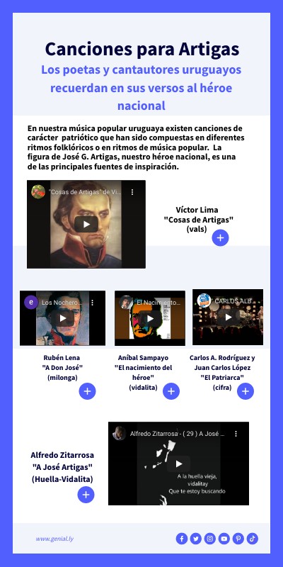 En nuestra música popular uruguaya existen canciones de carácter patriótico que han sido compuestas en diferentes ritmos folklóricos o en ritmos de música popular. La figura de José G. Artigas, nuestro héroe nacional, es una de las principales fuentes de inspiración.