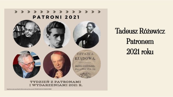 Patronem 2021 r. został również Tadeusz Różewicz, wybitny polski poeta, dramaturg, prozaik i scenarzysta, głęboko związany z losem pokolenia wojennego, baczny obserwator życia codziennego, społecznego i politycznego. W 2021 r. przypada 100. rocznica urodzin Różewicza. „Filozoficzna i egzystencjalna głębia obecna w twórczości Różewicza ma charakter uniwersalny, dzięki czemu nie tylko trafia do odbiorców z całego świata, ale jeszcze długo będzie oddziaływać na współczesną literaturę polską” - napisano w dokumencie.