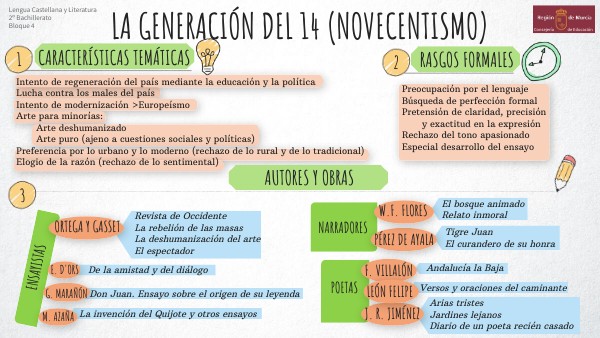 Intento de regeneración del país mediante la educación y la política Lucha contra los males del país Intento de modernización >Europeísmo Arte para minorías:Arte deshumanizado Arte puro (ajeno a cuestiones sociales y políticas)Preferencia por lo urbano y lo moderno (rechazo de lo rural y de lo tradicional) Elogio de la razón (rechazo de lo sentimental)