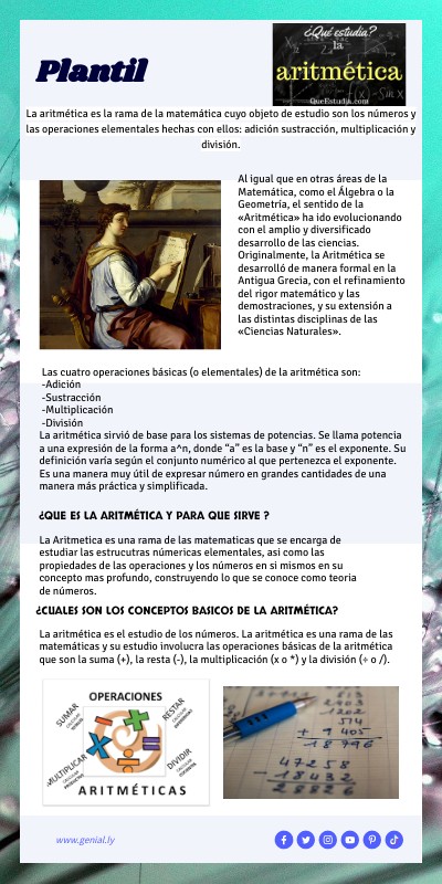 La aritmética es el estudio de los números. La aritmética es una rama de las matemáticas y su estudio involucra las operaciones básicas de la aritmética que son la suma (+), la resta (-), la multiplicación (x o *) y la división (÷ o /).