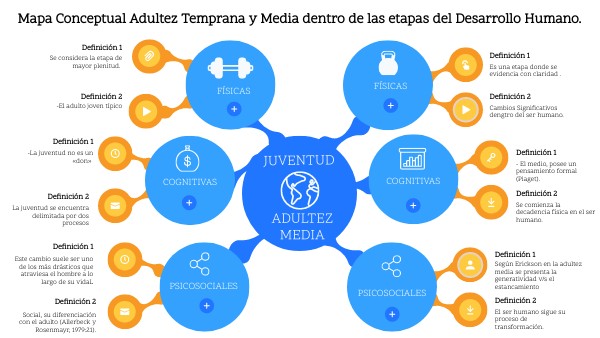Mapa Conceptual Adultez Temprana y Media dentro de las etapas del Desarrollo Humano.