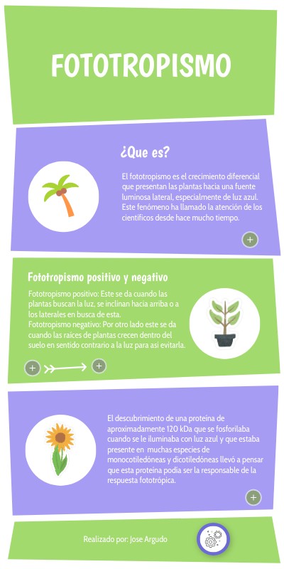 Fototropismo positivo: Este se da cuando las plantas buscan la luz, se inclinan hacia arriba o a los laterales en busca de esta.Fototropismo negativo: Por otro lado este se da cuando las raíces de plantas crecen dentro del suelo en sentido contrario a la luz para asi evitarla.