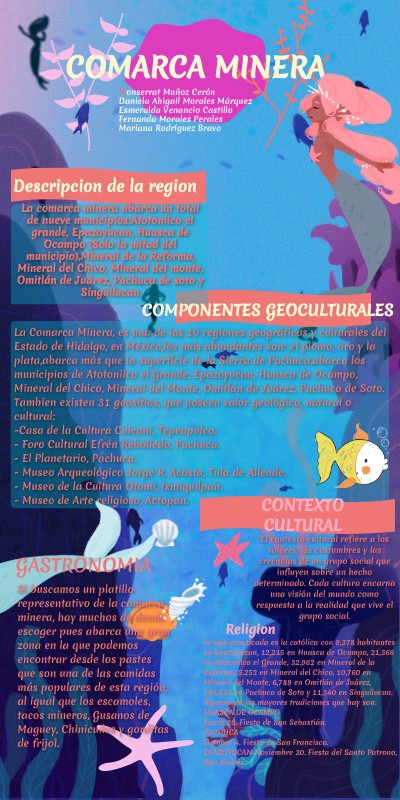 Ruta de la Comarca Minera | México Desconocido. (2021). Retrieved 25 September 2021, from:https://www.mexicodesconocido.com.mx/viajes_por_carretera/ruta-de-la-comarca-minera COMARCA MINERA, HIDALGO UNESCO GLOBAL GEOPARK (Mexico). (2021). Retrieved 25 September 2021, from https://en.unesco.org/global-geoparks/comarca-minera-hidalgo El Paisaje Minero de Pachuca, Hidalgo, México. Patrimonio Industrial en la Comarca Minera. (2020). Retrieved 25 September 2021, from https://editorialrestauro.com.mx/el-paisaje-minero-de-pachuca-hidalgo-mexico-patrimonio-industrial-en-la-comarca-minera/ Comarca Minera Geoparque Mundial – Hidalgo México. (2021). Retrieved 25 September 2021, from https://geoparquecomarcaminera.mx/# La Comarca Minera de Hidalgo, en México: un geoparque con el resplandor de la plata. (2020). Retrieved 25 September 2021, from https://www.atmosfera.unam.mx/la-comarca-minera-de-hidalgo-en-mexico-un-geoparque-con-el-resplandor-de-la-plata/ Las delicias de la Comarca Minera- Criterio Hidalgo. (2018). Retrieved 25 September 2021, from https://criteriohidalgo.com/fin-de-semana/las-delicias-de-la-comarca-minera ᐅ Top 10 Comidas Típicas de Hidalgo【Platillos, Ingredientes y Preparación】. (2021). Retrieved 25 September 2021, from https://lanzateyviaja.com/hidalgo/comidas-tipicas La comarca minera. (2021). Retrieved 25 September 2021, from https://prezi.com/_dawimdheams/la-comarca-minera/ Hidalgo.- Epazoyucan. (s. f.). Enciclopedia de los Municipios de México. http://intranet.e-hidalgo.gob.mx/enciclomuni/municipios/13022a.htm Hidalgo.- Huasca de Ocampo. (s. f.). Enciclopedia de los Municipios de México. Recuperado 25 de septiembre de 2021, de http://intranet.e-hidalgo.gob.mx/enciclomuni/municipios/13024a.htm Hidalgo.- Atotonilco el Grande. (s. f.). Enciclopedia de los Municipios de México. Recuperado 25 de septiembre de 2021, de http://intranet.e-hidalgo.gob.mx/enciclomuni/municipios/13012a.htm Hidalgo.- Mineral de la Reforma. (s. f.). Enciclopedia de los Municipios de México. Recuperado 25 de septiembre de 2021, de http://intranet.e-hidalgo.gob.mx/enciclomuni/municipios/13051a.htm Hidalgo.- Mineral del Chico. (s. f.). Enciclopedia de los Municipios de México. Recuperado 25 de septiembre de 2021, de http://intranet.e-hidalgo.gob.mx/enciclomuni/municipios/13038a.htm Hidalgo.- Mineral del Monte. (s. f.). Enciclopedia de los Municipios de México. Recuperado 25 de septiembre de 2021, de http://intranet.e-hidalgo.gob.mx/enciclomuni/municipios/13039a.htm Hidalgo.- Omitlán de Juárez. (s. f.). Enciclopedia de los Municipios de México. Recuperado 25 de septiembre de 2021, de http://intranet.e-hidalgo.gob.mx/enciclomuni/municipios/13045a.htm Hidalgo.- Pachuca de Soto. (s. f.). Enciclopedia de los Municipios de México. Recuperado 25 de septiembre de 2021, de http://intranet.e-hidalgo.gob.mx/enciclomuni/municipios/13048a.htm Hidalgo.- Singuilucan. (s. f.). Enciclopedia de los Municipios de México. Recuperado 25 de septiembre de 2021, de http://intranet.e-hidalgo.gob.mx/enciclomuni/municipios/13057a.htm Desconocido, M. (2010, 21 junio). Costumbres, fiestas y tradiciones en Hidalgo. México Desconocido. https://www.mexicodesconocido.com.mx/costumbres-fiestas-y-tradiciones-hidalgo.html