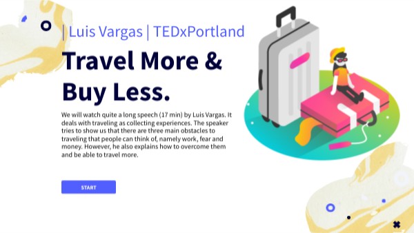 We will watch quite a long speech (17 min) by Luis Vargas. It deals with traveling as collecting experiences. The speaker tries to show us that there are three main obstacles to traveling that people can think of, namely work, fear and money. However, he also explains how to overcome them and be able to travel more.